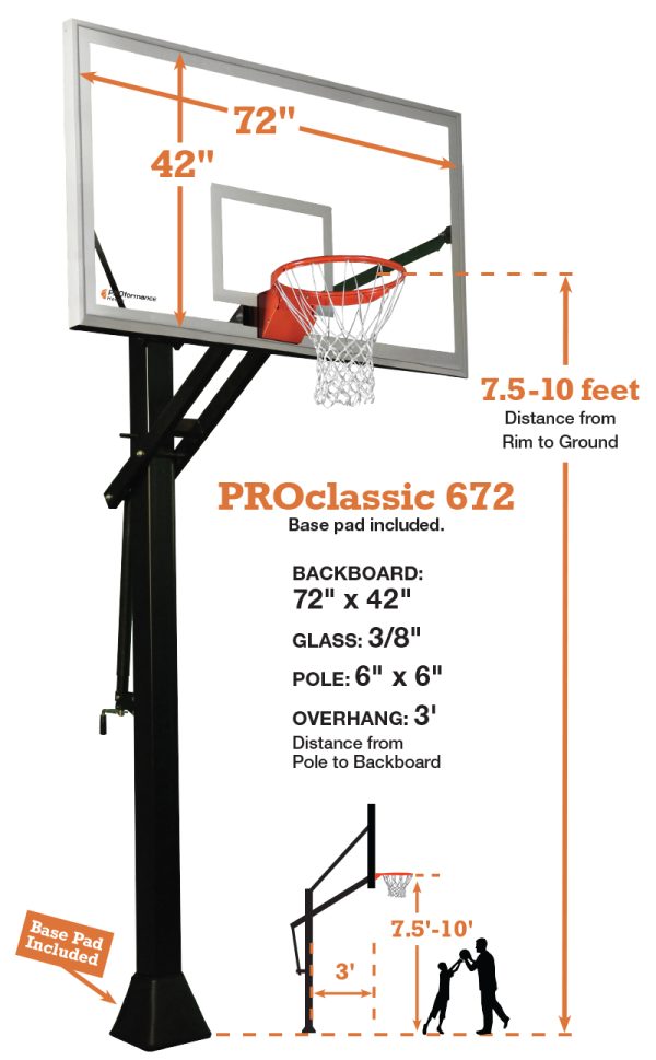 The PROformance Hoops® PROclassic 672 Hoop with it’s 72in x 42in Tempered Glass Backboard, 6in x 6in one piece steel pole and stainless steel hardware is the ultimate value to introduce your family to driveway fun. The 7.5ft-10ft adjustable backboard allows for any age kid to enjoy the superior playability that the system has to offer. The Bolt-to-steel rim with its Hide Away net, and protective base add to the safety, stability and durability only found on all PROformance Hoops®.