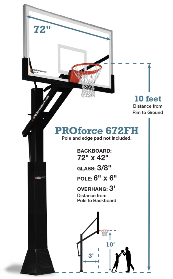 The PROforce 672FH is a pro-style, in-ground basketball hoop featuring a regulation 72inx42in, 1/2in thick Tempered Safety Glass Backboard. Dunking on the 10ft backboard has never been safer with the Bolt-to-Steel, Dual Spring Rim and Hide-Away net attachment. Top it off with PROformance’s Pole, Gusset and Backboard Padding and you have the safest, most durable and most stable hoop in the neighborhood.